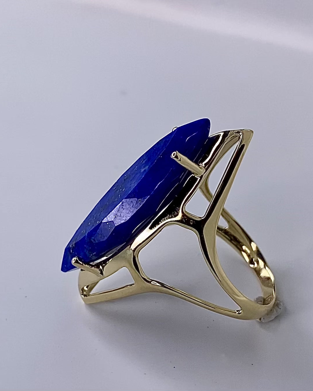 This Vesica Lapis Ring has one-of-a-kind pyrite inclusions. This Marquise cut features triangular facets on the girdle. It announces itself by its symmetry and framing of the stone. Vesica Piscis is the symbol of creation, represented by the Marquise Cut which is a staple in Jewelry making.